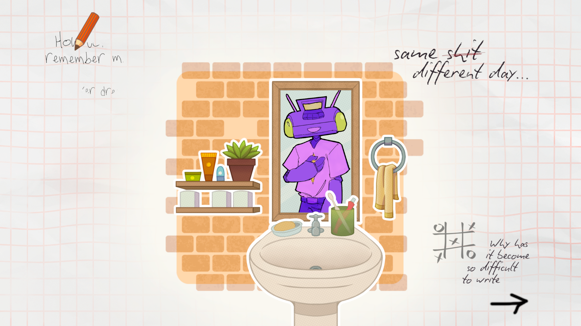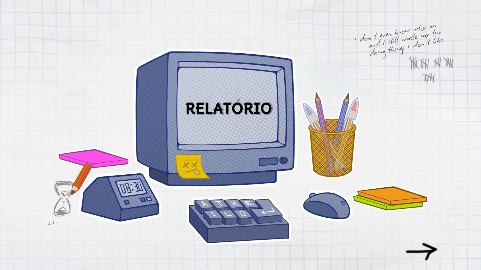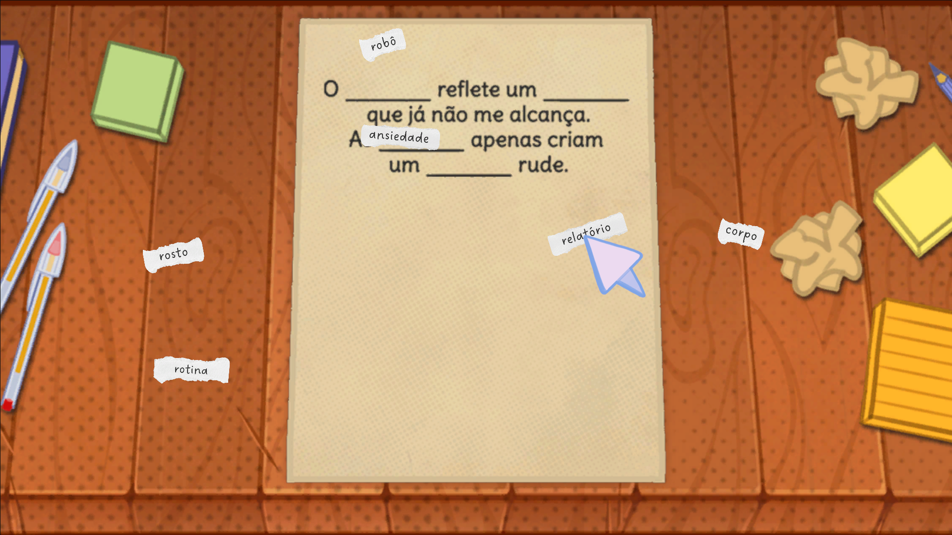 Arte bem bonitinha, mas também fiquei muito confuso no puzzle de completar as frases. Teve uma hora que um dos papéis ficou minúsculo depois de soltar do mouse, e não consegui mais clicar nele kk